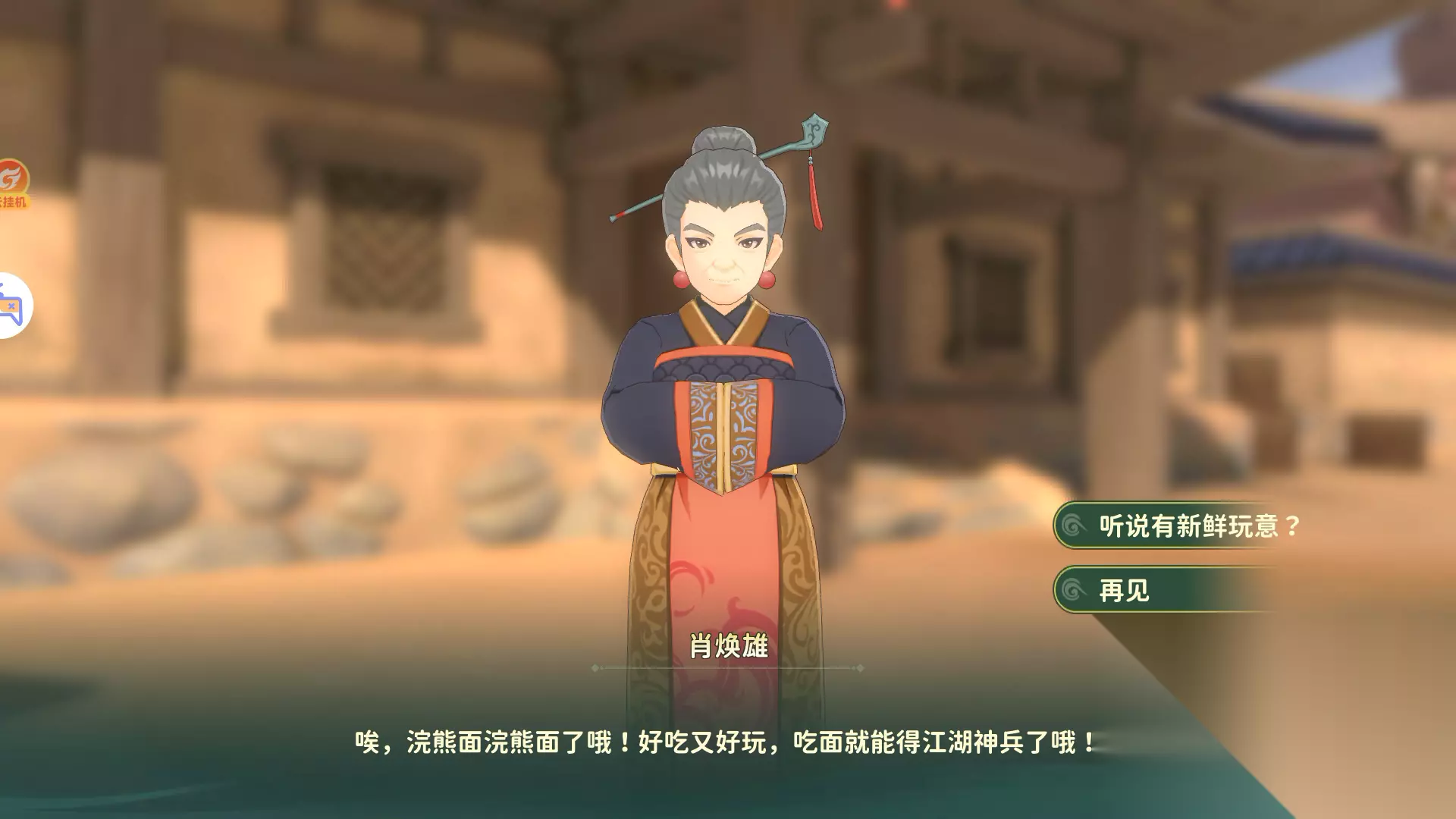 我们到达虎穴谷地图左上方的四合院建筑群,最上边的那个房子,看到面馆老板肖焕雄,过去交互即可。