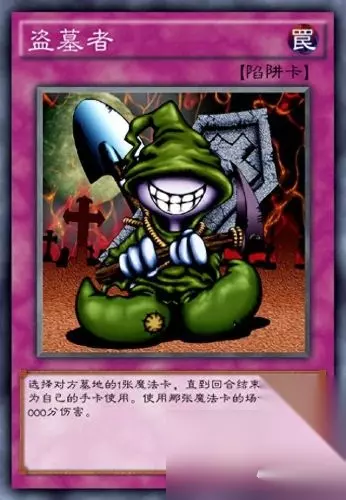 一、盗墓者 卡如其名,拥有盗窃两方墓地使用过的卡的可怕能力。卡图是一个看上去狡猾的角色,穿着不适合的衣服,身上有盗墓用的工具。在《游戏王DM》中有个关于“盗墓者”的梗。就是“城之内克也”连人手一张泛滥的“死者苏生”都没有,用“盗墓者”当作“死者苏生”,这对普通的决斗者来说何尝不是一种奢侈呢?