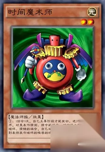 四、时间魔术师 这张卡是“武藤游戏”给“城之内克也”的礼物,可以说是友情的证明,也为他赢下了多场硬战,他在动漫中的效果十分变态,只要时间的轮盘转对了,就有无限的可能,如破坏对方的怪兽,让自己的怪兽进化。(宝贝龙变成千年龙。)而2分之一的中奖概率对赌王来说,简直就是白给。