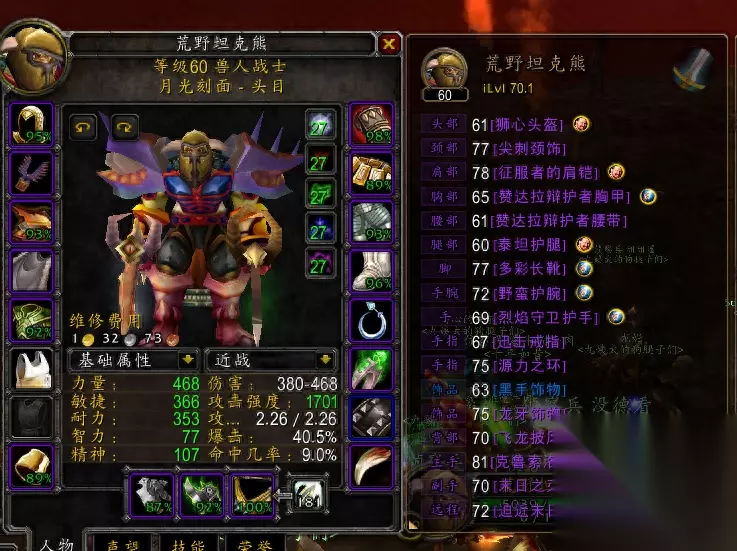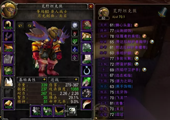 这是无BUFF时候的属性图,通过副手附魔敏捷弥补了一下暴击属性,同时保持命中为9%(为什么选择9%,这个命中打MC手感最舒服!) 得益于兽人种族天赋,不需要额外装备【剑师护手】来保证命中。 进行对比的一个顶级的剑系装备的【多彩剑】配的【剑师护手】(后续称剑系大佬),副手拿的毁灭,属于一快一慢的搭配。