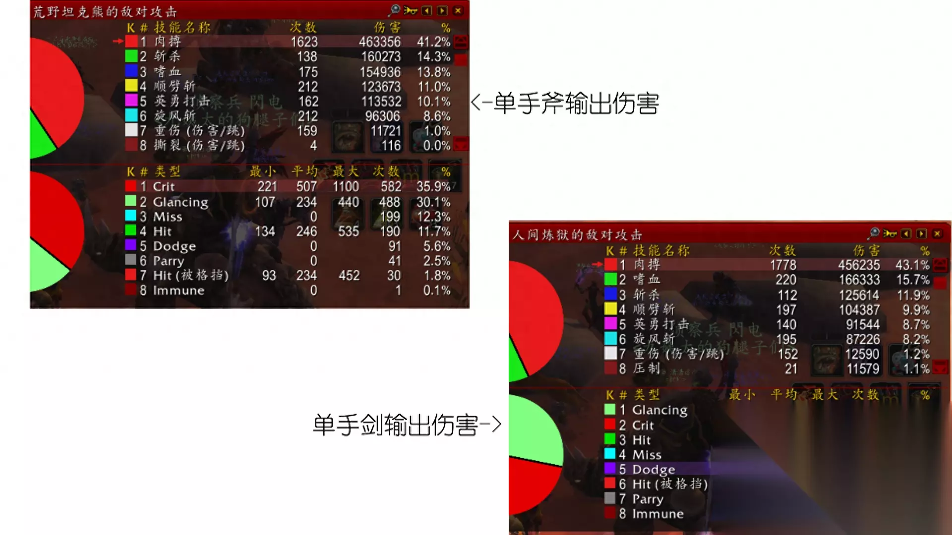剑系大佬整体装备绝对好过老熊,【灭绝胸甲】、【冲击束带】都是老熊想了好久不出的装备。 战斗数据对比 下面来看一下输出对比,因为本次是对比武器攻速数据,所以主要对比双方的肉搏伤害: