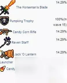 四、南瓜王掉落物概率 100%掉落南瓜王纪念章。 6.25~12.5%掉落南瓜王圣物和暗黑收割爆炸杰克南瓜灯。 25~50%掉落杰克南瓜灯发射器、玉米糖(50~100)、玉米糖步枪、乌鸦法杖、蜘蛛卵、黑色仙尘、蝙蝠权杖和无头骑士剑。 无头骑士之剑: 具备连击效果,击中目标后会召唤穿墙跟踪的南瓜头,适合近战玩家。 蝙蝠权杖(BatScepter): 召唤小蝙蝠攻击敌人,适合远程玩家。 黑精灵之尘(BlackFairyDust): 与飞翔之魂合成,制作出高飞翅膀,提升探索能力。 蜘蛛卵(SpiderEgg): 召唤小蜘蛛宠物,助你在探索中更加灵活。 糖豆机枪(CandyCornRifle): 射出可穿透敌人的糖豆,有效对付大群敌人。 暗夜之砾(RavenStaff): 召唤黑鸦进行攻击,适合在战斗中造成连续打击。 总结 挑战南瓜王需要玩家充分了解其不同阶段的特性,合理躲避攻击并选择适当的装备,无论是近战、远程还是魔法玩家,都可以通过合理的策略和反应击败这位强大的BOSS,获得丰富的战利品。