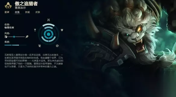 3、因为雷恩加尔的外形很像一头狮子,追人的时候跑起来像一条狗,所以他的外号是狮子狗,非常的形象。 4、如果对局中同时出现狮子狗和卡兹克,那么这局游戏会触发狩猎者的彩蛋,谁先击杀谁就可以获得神秘奖励。