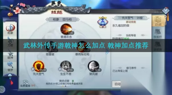 武林外传手游戟神怎么加点?戟神是武林外传手游中枪豪的转职职业之一,并列还有刀军和修罗两个职业,相对比这两个职业来说,戟神更能突出枪豪的特点。玩家如果比较喜欢戟神这样帅气的近战职业,不妨先来看看下面戟神加点推荐内容。