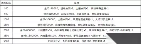 活动规则:活动期间,累计充值惊天回馈,土豪合同、高级装备、万能卡片、传奇球员范巴斯滕、里杰卡尔德等珍贵物品免费抱回家,伙伴们还等什么呢,赶紧来吧! 活动2:【累计消费大奖等你拿】 活动时间:1月26日15:00-1月29日15:00; 活动奖励: