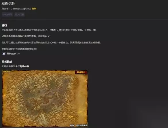 2、在角色没有满级的时候将这七个任务完成就可以获得比较高的声望奖励。 3、之后在(38.8,25.5)坐标找到大铁匠博恩奈特可以接到三个声望任务。 4、总计收集熏火龙鳞片2+皇血草4+煤块3+铁锭4+重皮10就可以提交给三个声望任务获得声望奖励。 5、提交之后就会将声望达到友善。 友善——尊敬 达到友善之后会自动接到【获得信任】任务,使用黑铁残油重复提交就可以达到尊敬。