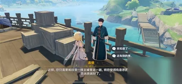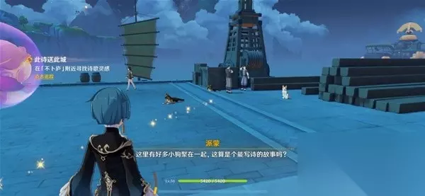 从谈话中我们得知,他还没有写诗的灵感。我们需要去璃月港收集一些有趣的东西并通知他。