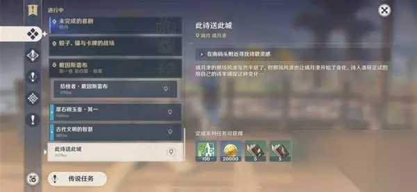 《原神》游戏中隐藏着许多隐藏任务和成就。很多玩家可能不知道,《原神》中的璃月地图有一个隐藏任务“将这首诗送到这座城市”。完成“将这首诗送到这座城市”的任务后,可获得璃月声望+20。接下来我给大家带来《原神》此诗送此城任务具体攻略,一起来看看吧!