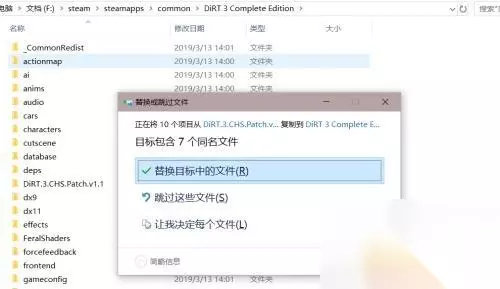 6.将frontend和language这两个文件夹复制到steam中尘埃3的下载安装目录下,我这里安装的是F盘,所以我的目录是F:\steam\steamapps\common\DiRT 3 Complete Edition 7.win7提示复制时会提示此位置已经包含同名文件,我们这里选择第一个:复制和替换 8.win10会提示目标包含7个同名文件,这里我们选择第一个替换目标中的文件