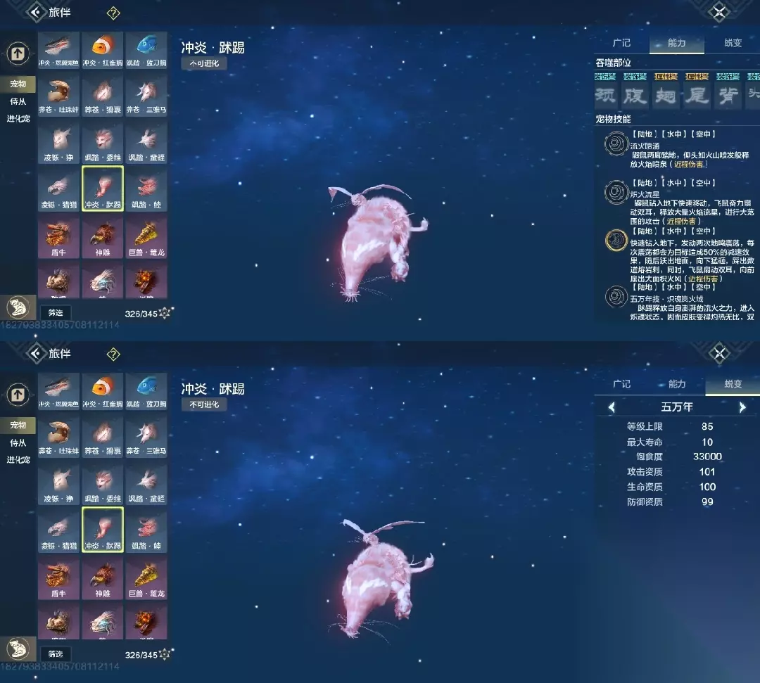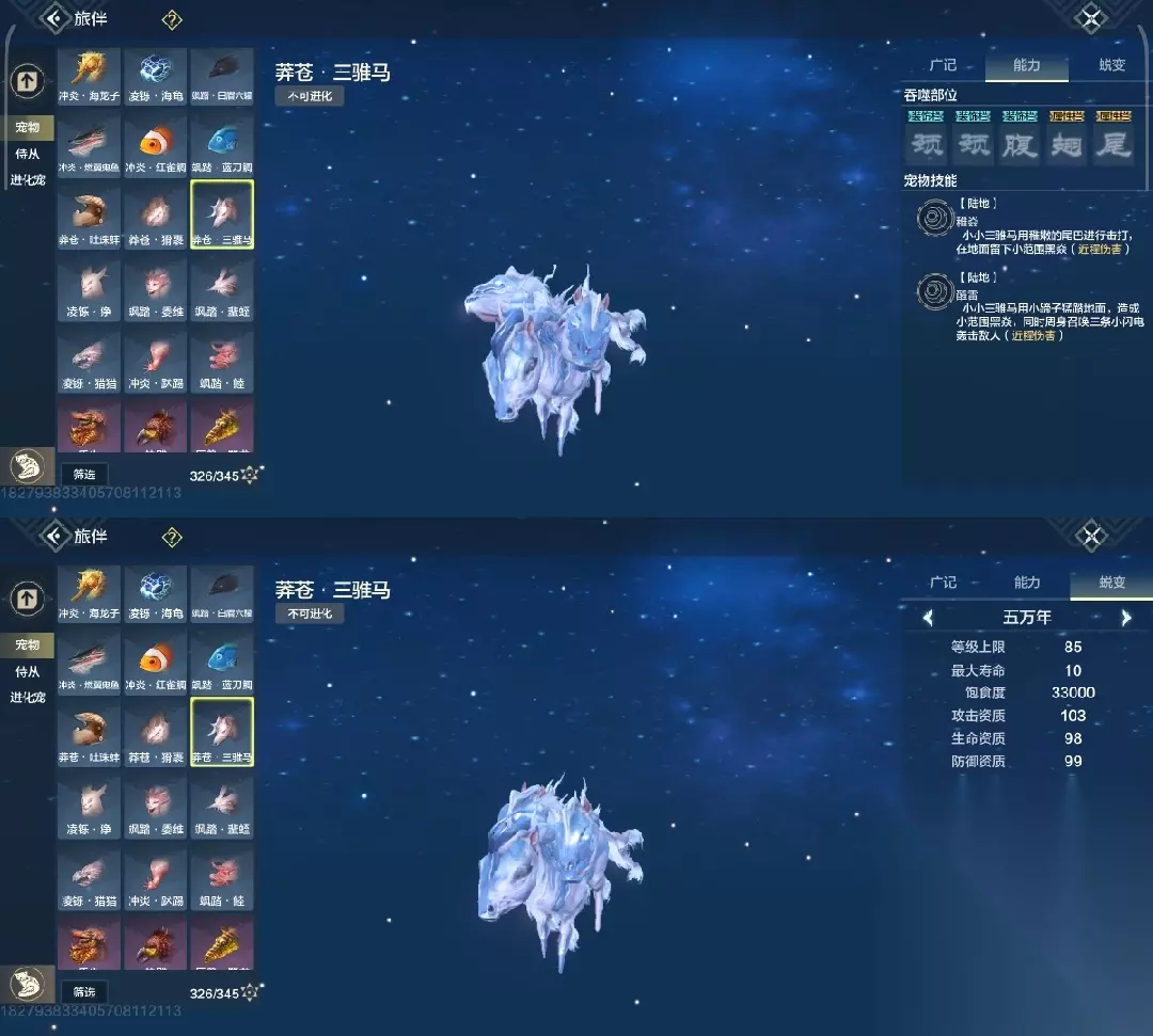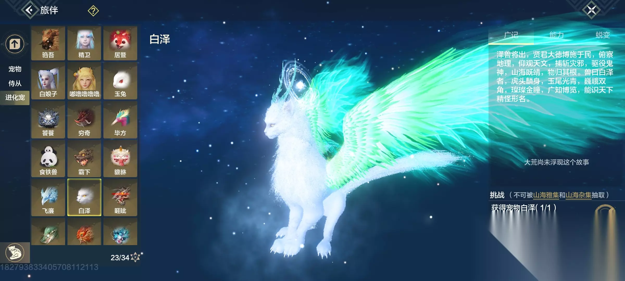 白泽 斗兽t1,四穿透部位,三尾巴一翅膀部位,吞噬变异部位最便宜的一只进化宠,养成成本大缩减,互动吞噬青木灵蕴短暂提高对应属性,2000元素穿透也未尝不可(必养)