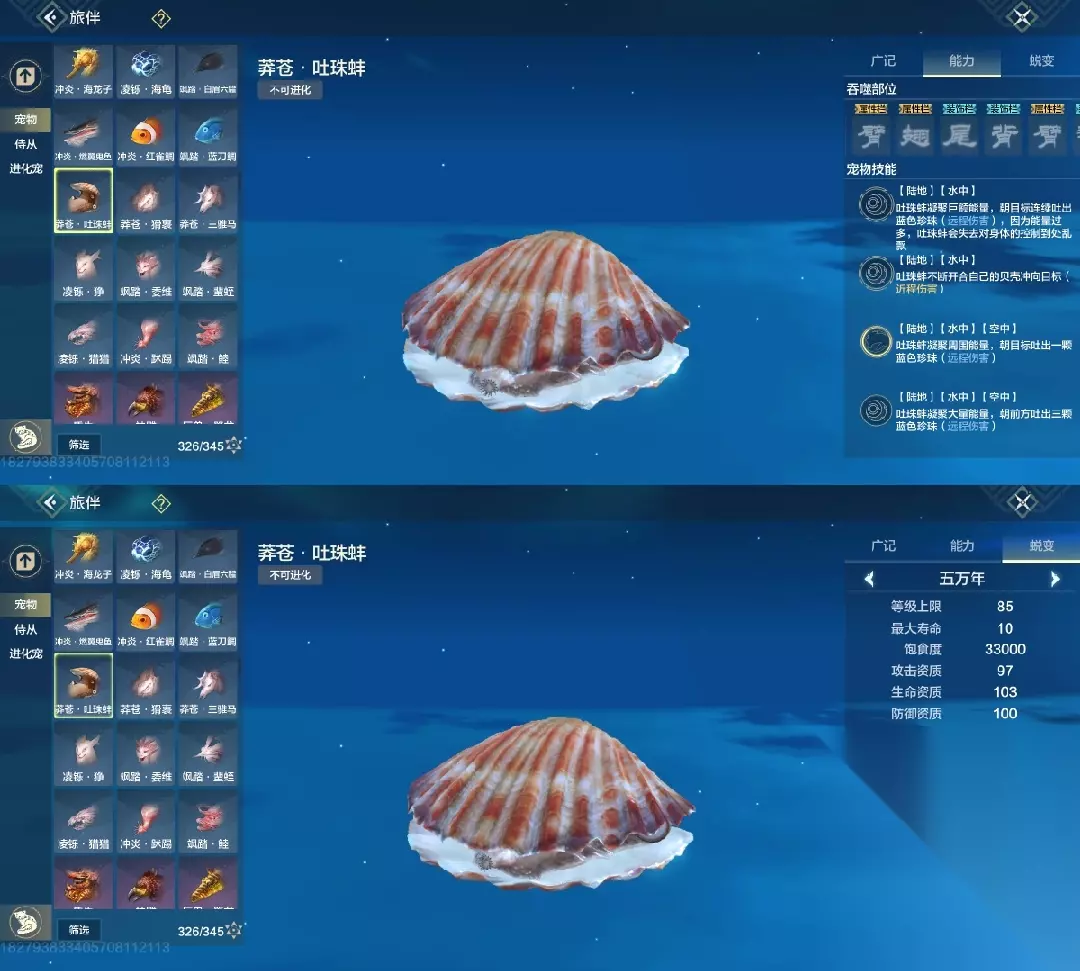 吐珠蚌 三穿透部位,97攻击资质,南海有幼年(推荐培养)
