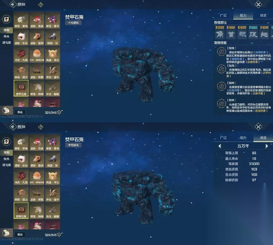 焚甲石夷 103攻击资质野宠,能当驼兽,并且是当前最高攻击资质的驼兽,但变异部位有脖子,天生比同阶元素数值低,追求驼兽大荒攻击高的,可以考虑养,驼兽状态同样不能飞天,斗兽能力弱
