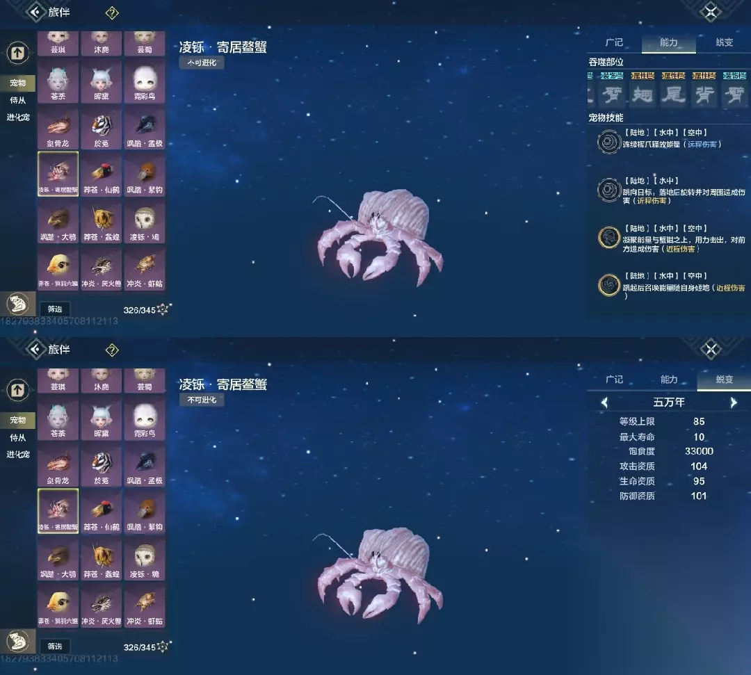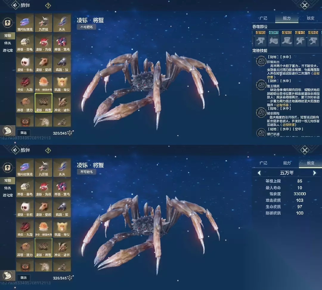 将蟹 三穿透部位,攻击资质103,攻击资质很重要,偏转一看穿透部位,二看的就是攻击资质,但没幼年,最低年份只有千年,高偏转比较看缘分(必养)