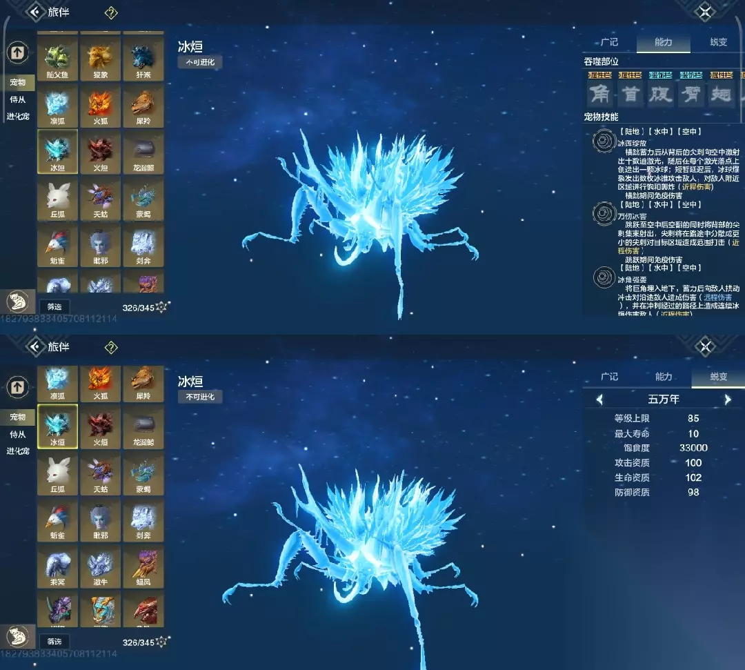 后续有新的偏转宠物,值得培养再考虑新的,其他偏转真没几个好的 ↓↓无偏转野宠↓↓ 冰煊 100攻击资质的野宠,焕新最成功的野宠,魂技适配度高,斗兽能力超强,斗兽也是t0.5,还能当驼兽,但驼兽状态不能飞天
