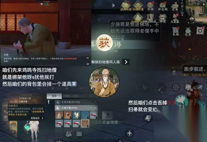 点击查看详情>>>《一梦江湖》江湖万象替天行道外观获取攻略 五、浮屠西来外观获取 来到金陵(445,436)咱们先来找扫地僧~通过跟他切磋拿到道具【扫帚】,丢弃,【扫帚】就会变成佛塔的钥匙,来到塔顶三层。