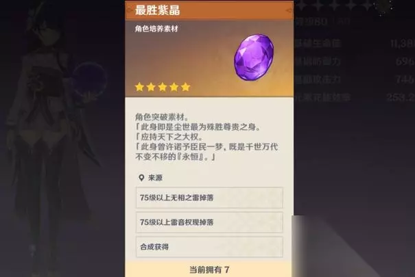 二:突破材料主要获取方法 1.各类紫晶 通过击杀无相之雷或者雷音权现可固定掉落