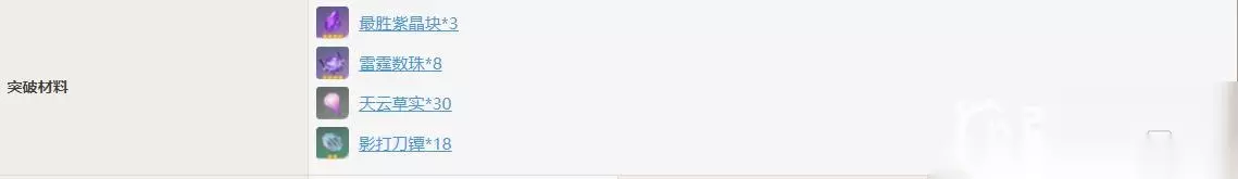 雷神从1级到90级总共得突破6次,每次的突破材料都不尽相同,总得来说,雷神突破需要大量的雷霆数珠,紫晶,刀谭以及天云果实.下面与各位旅行者分享相关知识 目录 一:突破材料详情 二:突破材料获取方法 三:突破后特殊属性奖励