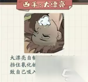 凶手:大漂亮 大漂亮自制的防毒面具无法挡住氰化物气体的侵袭,导致自己吸入氰化物中毒身亡。