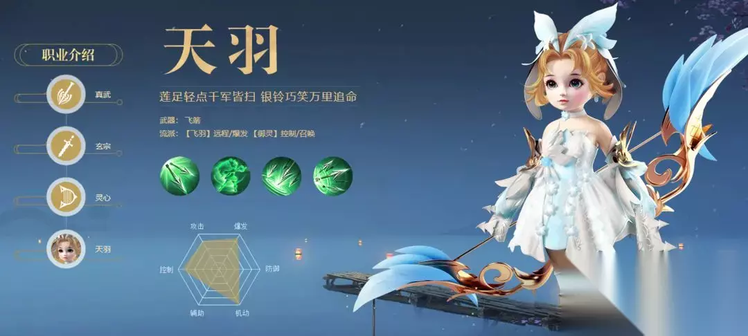 ④:天羽 飞羽(远程 / 爆发);御灵(控制 / 召唤) 远程法师职业,高输出低防御 又自带隐身技能 团战杀手 操作性较难 伤害最高职业,由于防御低 可建议中R大R直接拿肉宠浪淘沙作为主宠