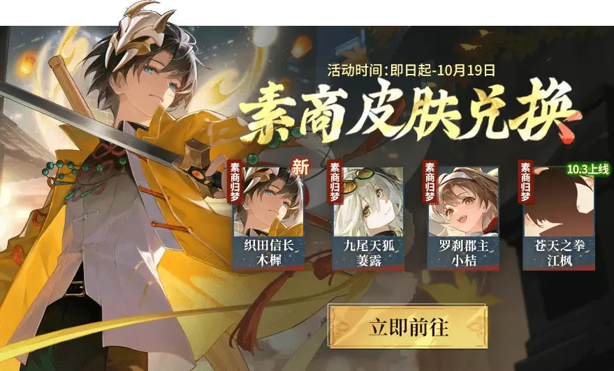 活动期间限定皮肤兑换开启,织田信长-木樨、九尾天狐-萋露、罗刹郡主-小桔、苍天之拳-江枫等你来拿!