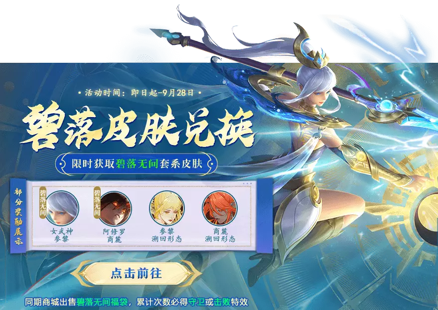 碧落皮肤限时兑换开启,女武神-参黎、阿修罗-商麓、小龙女-梦幻夏语、福娃-风馨圣使等你来拿!