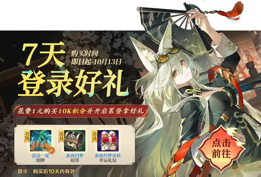 仅需一元购买10K积分,即可开启连续7天的登录福利!清凉一夏铭牌、素商归梦福袋、素商归梦皮肤幸运礼包!