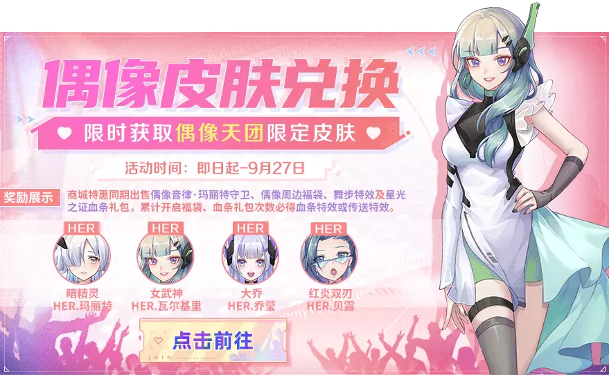 偶像皮肤兑换开启,暗精灵-HER.玛丽特、女武神-HER.瓦尔基里、大乔-HER.乔莹、红炎双刃-HER.贝露偶像天团限定皮肤!