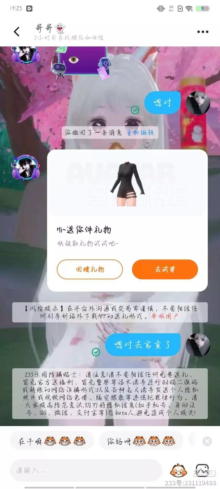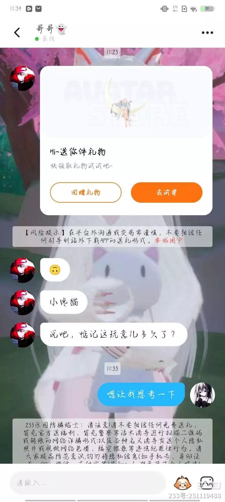 事情是,我就是在一个相亲大会里面玩,穿了一点贵的衣服,他就说要不要我帮你充钱?然后我就发了个疑问,然后我就说我认识你吗?他就就是说我有证据的然后我说我还是不相信你,你截图看看,嗯对请大家帮忙举报一下