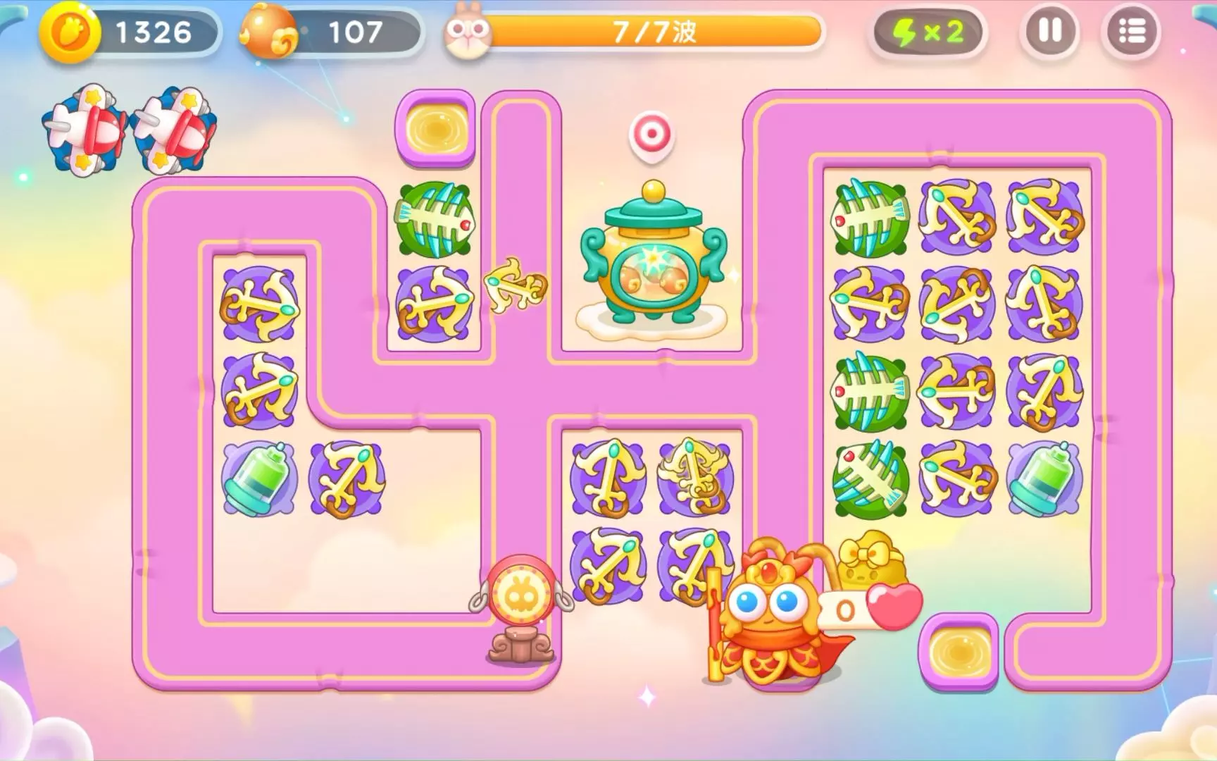 【第5波】老君离开后,在左上角放2个飞机,这样能有效缓解防守压力。 【第6波】老君到来后,依次定点右路最靠前的御剑兔。