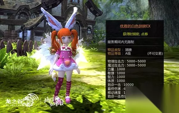 A级翅膀!优雅的白色翅膀强势回归! 《龙之谷》早些年的白/黑/红/金等七色大翅膀想必很多老谷迷都能如数家珍,一扇翅膀,亦承载着五彩缤纷的回忆。在本周四更新“秘境大冒险”后,当年优雅的白色翅膀强势回归,属性提升为A级,物攻/魔攻5000,力敏智体1000,致命1w,爆伤2w,还有600最终伤害。而除了沿袭先前的优雅白色风格,这次的翅膀更是加上了夺目的光芒,即便在黑暗中,也能发出耀眼的光彩哦。