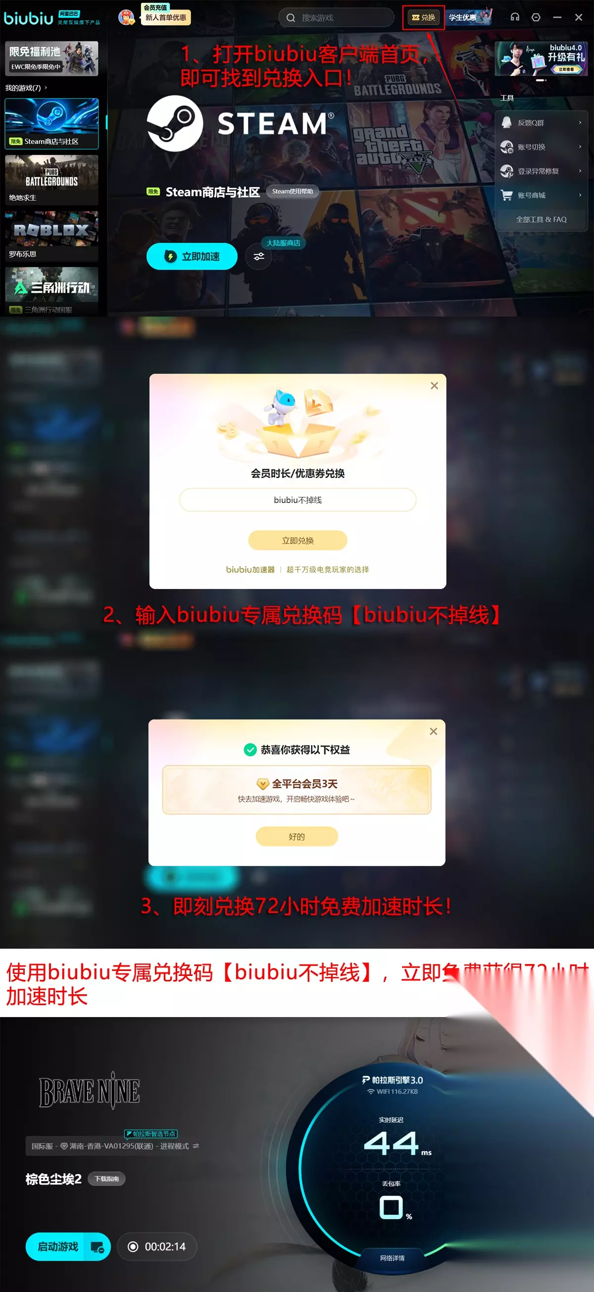 新用户注册即可获赠24小时免费加速时长;另可在首页输入兑换码【biubiu不掉线】,额外领取72小时服务权益。两项福利叠加后,总计可享96小时加速体验,覆盖整个联动活动周期。