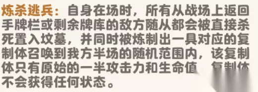 该技能是恶魔领主达到2级习得的技能,当双方领主在自身回合损失生命时,恶魔领主将恢复生命值,进一步提升了恶魔领主的战场能力。 进阶技巧:当恶魔领主达到4级时,该技能将得到加强,恢复双方领主所损失生命的50%血量,将提升至100%,也就是说,双方领主在自身回合收到多少伤害,恶魔领主就恢复多少血!可以配合技能卡、部分随从效果,给恶魔领主恢复生命,让恶魔领主成为“耐活王”! (5)技能5--炼杀逃兵