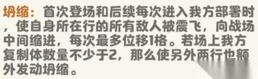 该技能让恶魔领主有着很好的战场能力,移动力减1使恶魔领主可以晚于其他友方随从,与敌方随从正面接触,而是在后面释放技能干扰敌方,同时,死亡有概率复活也加大了恶魔领主的容错率。 进阶技巧:当恶魔领主达到4级时,该技能将得到加强,在恶魔领主没有除“光环”外的任意状态时,复活概率将提升到66%,大大提高了复活概率!! (2)技能2--坍缩
