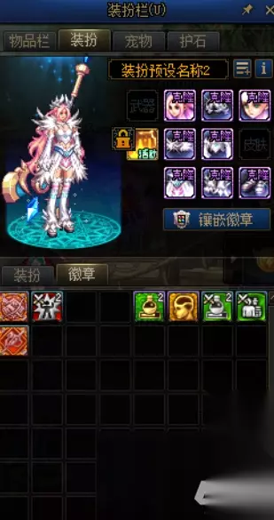 dnf徽章怎样镶嵌配备 1、首先在游戏中翻开物品栏,在配备一览中有镶嵌徽章的选项。