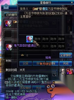 万圣节特快列车活动 活动时间:10月17日起 关1次万圣节特快列车地下城可获得奖励。