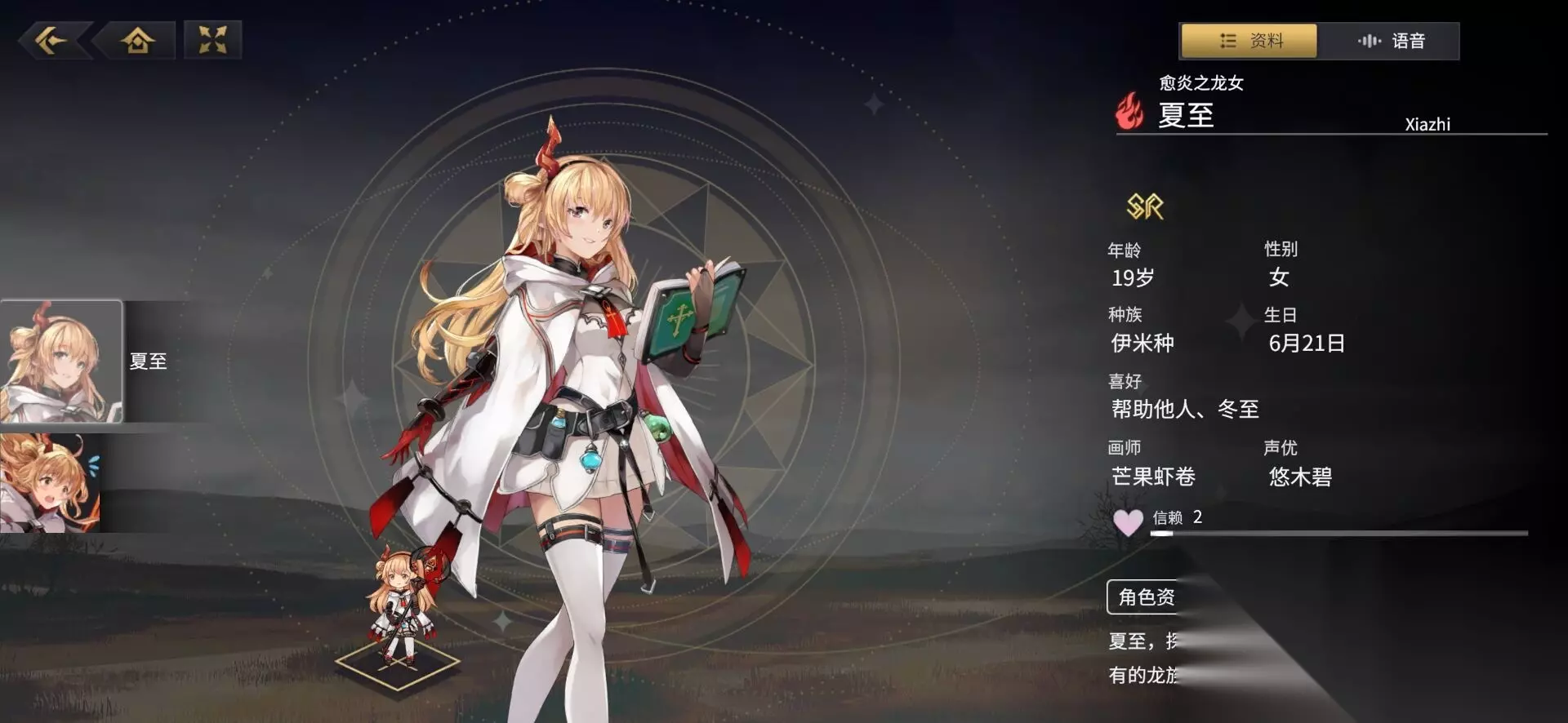 夏至:这是一个辅助回复型的角色,奥义技能对敌方全体造成伤害,并且施加灼烧效果,可以和其他火系角色进行搭配,最强的还是他的一技能和二技能,回复生命值,解除异常状态,提升火属性攻击力,再次提高火属性攻击力,并且增加复活效果,在没有伊莎贝拉这个光属性角色为队伍提供复生辅助的时候,夏至绝对是最强辅助。