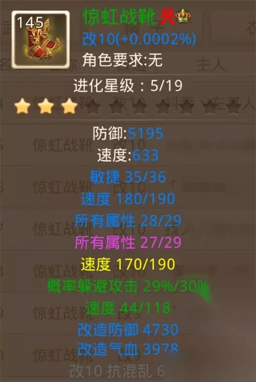 3.衣服 双所有抗异常+抗遗忘+抗冰冻,绿属性为概率解除五系门派障碍。 4.鞋子 双所有属性+双速度+单敏捷,绿属性一般为概率躲避,可以在不确定性的情况下,实现躲避对方的攻击,保证自身单位的存活率,共鸣属性为忽视障碍以及抗障碍。