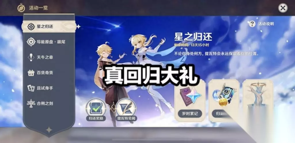 首先,这个回归大礼分为三个部分或者说五个部分,名为【星之归还】,登陆游戏直接可以领取【归还奖励】,100原石+大量经验书和摩拉,紧接着就是【岁时累记】+【归还之路】+【归途祝福】,三个部分都可以领取大量奖励,最简单的就是岁时累记,直接登陆即可领取原石,总共登陆7天可以获得400原石,加上最开始的100原石,一次回归直接送500+原石,玩家真的赚了。