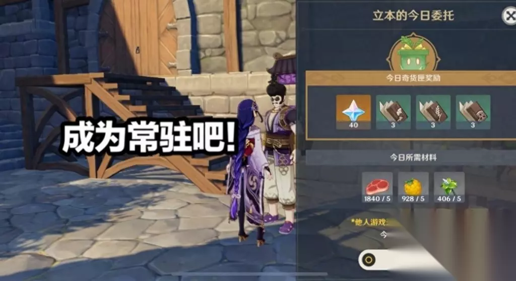 这其中,我最喜欢的就是立本的委托了,他应该是每个玩家的好兄弟了,首先是他亮眼的造型,一看就不属于提瓦特的世界,感觉就像是未来穿越过来的型男,而他要的东西都是玩家背包里面有的,有时候是几片薄荷和落落果有的时候会选择要兽肉,反正我们背包里不要的都是他想要的,给他之后直接获得40原石,真的是充满爱意的交换,不由得让玩家想要把立本变成常驻NPC,大家怎么看呢?欢迎分享自己的看法,我是盟盟,咱们有赞再见!