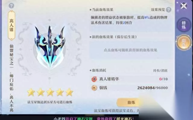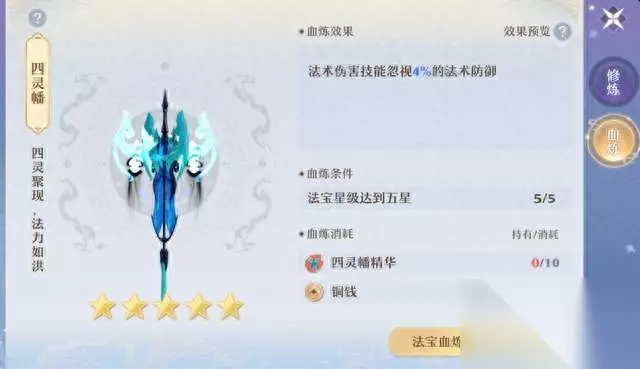 被动法宝的唯一选择:兽骨幡/灵妖幡+青灵境+玲珑石+鹤云幡。玲珑石血炼治疗暴击,双奶队可以血炼法力/怒气降低,提高PVP续航。 各门派的法宝和血炼效果的选择思路大致就是这些。其实,输出门派战斗中释放法宝的机会不多,对主动法宝要求不高。辅助、封印门派更应血炼好的主动法宝,帮助队内输出提高伤害,创造更好的输出环境!