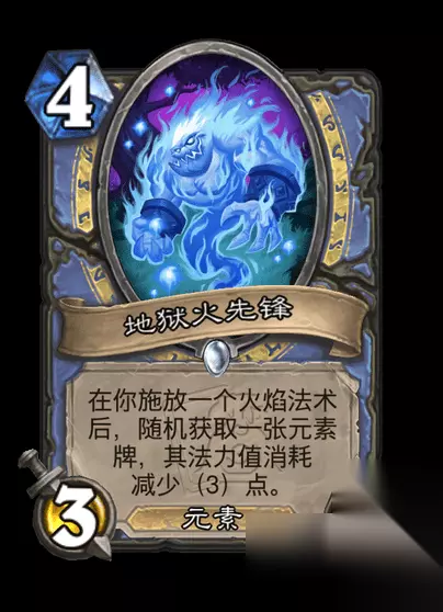 三、地狱火先锋:元素协同增益 卡牌信息: 类型:元素随从 稀有度:普通 制作消耗:40/400(金卡) 效果:施放火焰法术后随机获取一张元素牌(法力值-3) 战术价值: 降低元素牌成本,适合“元素体系”卡组(如“火山引擎”或“奥秘法”)。 与“冰霜元素”形成互补,提升后期爆发能力。