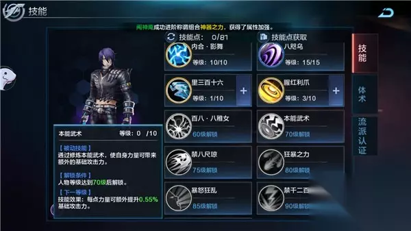 虽然看起来这招很弱很没用,但是仔细想,这招应该设计的十分巧妙,应该可以在一套连之后再来一次八稚女,大幅强化实战能力,提高连击次数,所以有两个建议 1.有点全点这招,强化实战能力 2.不学这招,跳过 这招要想发挥作用,必须点满,否则和没有一样 (这是蓝蓝自己的猜测,到时候具体效果要再看看,我说错了别喷啊,我也没打到那么高级) 十技能:本能武术(被动)(灵魂级别被动) 正因为这招的存在,才影响了我接下来对斯内克加属性点的解析,力量额外提升攻击力,无疑是强调了斯内克加点方案必须主力,并且一般到这个等级,力量300都是有的,即使是一级的这招,也能加165%的基础攻击力,可以说是灵魂被动了,推荐大家能点一定要点!