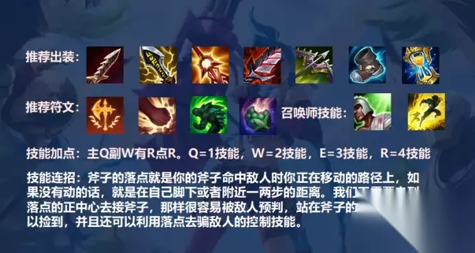 英雄联盟手游荣耀行刑官德莱文怎么样?德莱文在英雄联盟中是非常受欢迎的射手,他在下路对线能力很强,那么他在手游中会怎么样呢,下面就和小编一起来看看吧。 英雄联盟手游荣耀行刑官技能加点 技能加点:主Q副W,有大点大 英雄类型:射手 英雄介绍: 在诺克萨斯,有一种战士被称为清算人。他们在竞技场里互相厮杀,以鲜血作为赌注进行力量的考验,不过没有任何人能像德莱文那样受人追捧。曾经参过军的他,发现竞技场的观众们尤为喜爱他的耀武扬威和刻意表演,和他使用飞斧的无匹技艺。这种狂傲的完美带来的赞叹令他上瘾,因此德莱文发誓要不惜代价打败任何对手,以此确保自己的名字在帝国之中永世传唱。 技能介绍: 被动技能:德莱文联盟 在接住一把旋转飞斧或者击杀了一个小兵、野怪或防御塔后,德莱文会从他的粉丝那里获得崇拜效果。击杀一名敌方英雄会为德莱文提供额外赏金,赏金的多少取决于他拥有多少层崇拜效果。 1技能:旋转飞斧 德莱文的下次攻击会造成额外物理伤害。这个斧头将会从目标身上弹到高空。如果德莱文接住了它,那么会立刻准备好下一发旋转飞斧。德莱文可以同时拥有2发旋转飞斧。1月11日7.1版本更新: 德莱文的下次攻击会造成额外物理伤害。额外伤害相当于35/40/45/50/55加上他额外攻击力的65/75/85/95/105%。 这个斧头将会从目标身上弹到高空。如果德莱文接住了它,那么会立刻准备好下一发旋转飞斧。 德莱文可以同时拥有2发旋转飞斧。 距离:300 2技能:血性冲刺 德莱文获得移动速度和攻击速度加成。移动速度加成在持续时间过后会急剧下降。在接到一把旋转飞斧后,血性冲刺会立刻冷却完毕。德莱文获得40/45/50/55/60%的移动速度加成,持续1.5/1.5/1.5/1.5/1.5秒;并获得20/25/30/35/40%的攻击速度加成,持续3/3/3/3/3秒。在持续时间里,移动速度加成会急剧降低。 在接到一个旋转飞斧后,血性冲刺将会立刻冷却完毕。 3技能:开道利斧 德莱文扔出他的斧头,对命中的目标造成物理伤害,并将他们击退至一边。被命中的目标会受到减速效果。德莱文扔出他的斧头,对目标造成75/110/145/180/215【+0.5*额外AD】物理伤害,并将他们击退到一边。被命中的目标将被减速20/25/30/35/40%,持续2/2/2/2/2秒。 距离:1050 4技能:冷血追命 德莱文掷出两柄大斧,对命中的每个单位造成物理伤害。在命中一名敌方英雄后,大斧会缓慢地调转方向,并回到德莱文身边。在斧头正在向外飞的时候,德莱文可以激活该技能来让斧头早点飞回来。每命中一个单位,伤害值就会减少。在斧头调转方向时,伤害值会重置。德莱文掷出两柄大斧,对命中的每个单位造成175/275/375【+1.1*额外AD】点物理伤害。 在命中一名敌方英雄后,大斧会缓慢地调转方向,并回到德莱文身边。在斧头正在向外飞的时候,德莱文可以激活该技能来让斧头早点飞回来。每命中一个单位,伤害值就会减少8%【最小值为40/40/40%】。在斧头调转方向时,伤害值会重置。 距离:全屏 出门装: 直接选择长剑出门就可以了。 核心装备: 第一件推荐出饮血剑,饮血剑的吸血能力相信大家都比较了解,这件装备出来之后德莱文的生存能力有很大的提升,而且伤害也比较高。 第二件推荐出无尽之刃,现在的无尽自带暴击几率,加强的是暴击伤害,所以在不出其他暴击装备的时候也可以先出无尽之刃来加强伤害能力了。 第三件推荐出疾射火炮,出火炮主要是为了提升德莱文的攻击距离,并且让他的攻速可以堆满打的更快。 鞋子方面: 在这里面荣耀行刑官出攻速鞋就可以了,基本上见面就是打架然后秒人,出攻速鞋加强自己的伤害能力就行了。