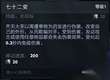 此技能有一定的迷惑能力,还可以躲技能,但是不要过分依托此技能躲伤害,CD长且失误率较高,不过多多练习找一下感觉,是可以轻松躲掉丽娜的大,lion大,蓝猫残影的,但是只能躲避技能的伤害不能躲技能伤害的附带效果,比如女王的毒镖可以躲避第一段伤害,后续的伤害还是有的。在变形状态下若受到伤害会变回原形,被敌方追杀时,如果敌方没有AOE技能释放,大圣可躲进树林变成树,迷惑敌方再跳树逃生,变成树后,除非敌方A你的单位,不然A地板也找不到你的。 Tip1:齐天大圣变成信使时移动速度与信使一致。 猴子猴孙