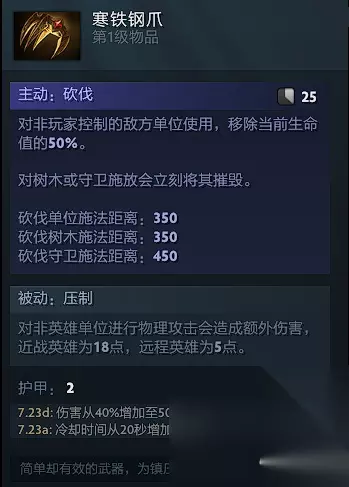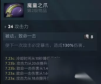 补刀斧必备,由于现在近战自带格挡,无需买圆盾,对线可以携带更多的属性装,让队友养两棵吃树,在一般情况下控到2个赏金后就可以用信使运一个大药过来,如果队友只给了一棵吃树,那就买组吃树,一定不能断药 1号位