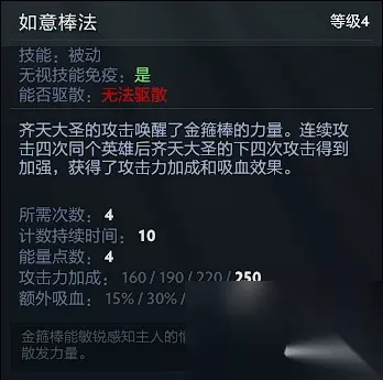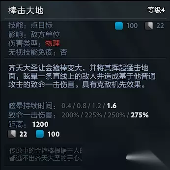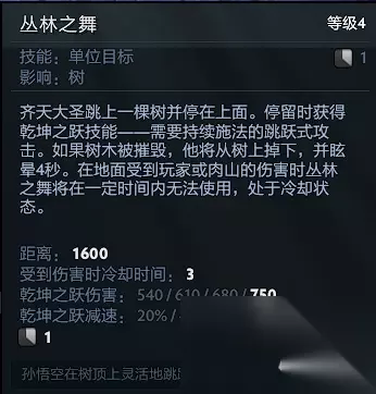 大圣的位移技能,加天赋后具有极强的切入和逃生能力,也是大圣刷钱的主要技能,可选择蓄力,蓄力时间越长减速时间越长伤害越大,前期带2个小蓝可实现一直用此技能刷钱,刷钱速度很可观,需要注意的是,在树上敌方是无法看得到你的,但是如果敌方破坏树木,大圣从树上掉下来,会被原地眩晕4秒,即使开bkb也是要被眩晕,所以跳树的时候一定注意是否有敌方视野。 Tip1:丛林之舞在落地时进入冷却。Tip2:右键点击地面后齐天大圣会从树上跳下。 如意法棒