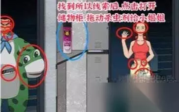 5.最后一个场景点击血迹、手表、眼镜、美甲、一袋牛肉。 6.找到所有线索后,点击打开储物柜,拖动杀虫剂给小姐姐就可以了。