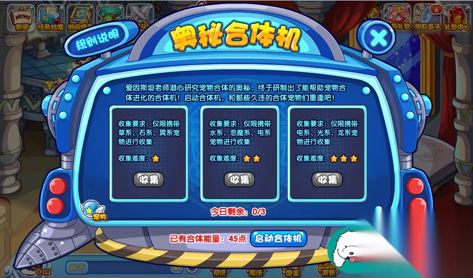 洛克王国2024奥秘合体机活动具体内容介绍 活动时间和难度:活动从3月8日起开始,难度为★☆☆☆☆。在奥秘合体机活动中,玩家可以选择三个任务进行挑战。每个任务都限制了宠物属性进行挑战,收集难度越高,战胜后所获得的合体能量越多。每日有三次机会,最高可获得15点合体能量。