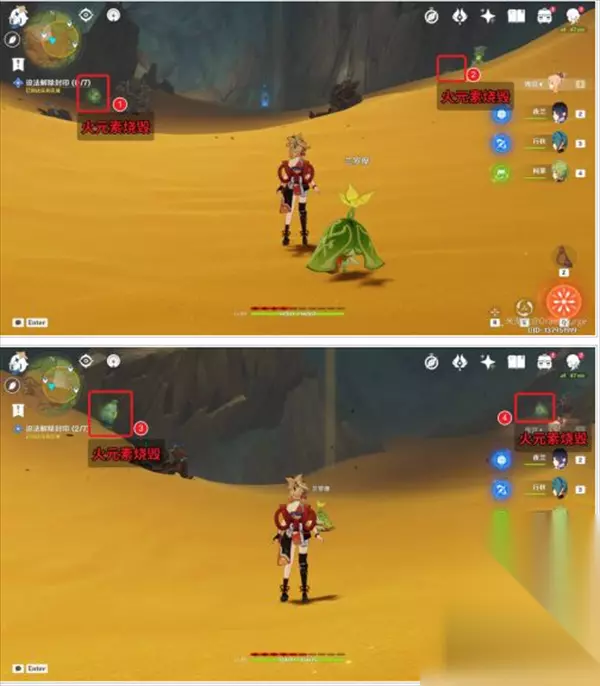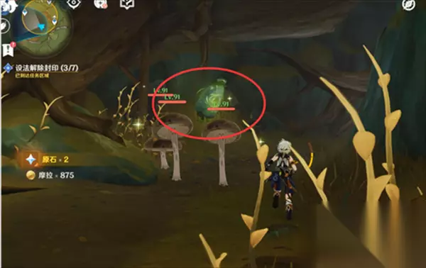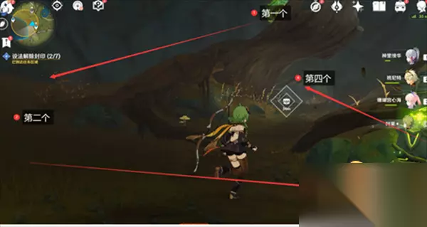 言归正传,这七个封印想要全部解除的话,需要借助琴对着花和草种子演奏大梦的曲调,还有就是4个草靶子的位置比较阴间,容易看漏。 首先最开始的封印如下图