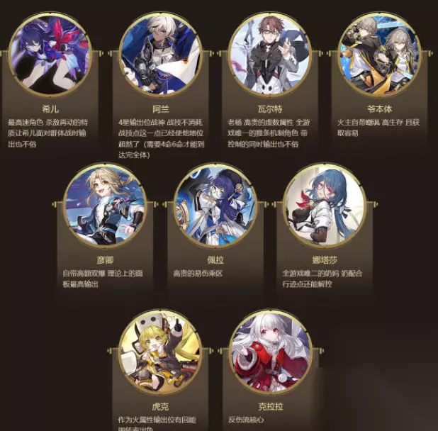 T1榜: 1、希儿:最高速角色,杀敌再动的特质让希儿面对群休战时输出也不俗。 2、阿兰:4星输出位战神,战技不消耗战技点这一点已经使他地位超然了需要4合6命才能到达完全体。 3、瓦尔特:老杨高贵的虚数属性,全游戏唯一的推条机制角色,带控制的同时输出也不俗。 5、彦卿:自带高额双暴,理论上的面板最高愉出。 6、佩拉:高出的易伤乘区。 7、娜塔莎:全游戏唯二的奶好,奶配合行迹点还能解控。 8、虎克:作为火属性输出位有回能周转率出色。 9、克拉拉:反伤流核心。